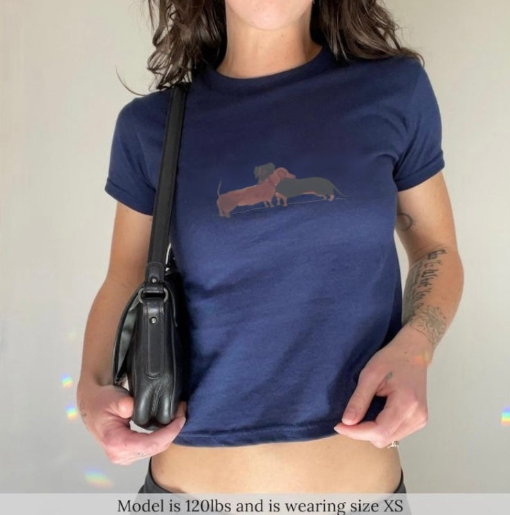 Too cute to handle! This baby tee features an adorable sausage dog giving the sweetest hug. Soft, slightly cropped, and perfect for layering or wearing on its own. Cozy vibes and happy hearts guaranteed!